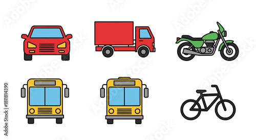 Naklejka premium red car red truck green motorcycle yellow bus black bicycle on white background