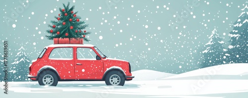 © Georgii, Obraz premium Red car with Christmas tree on snowy rooftop in winter scene