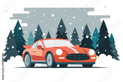 Naklejka premium Red car with white stripe stands in front of a forest, on a snowy day