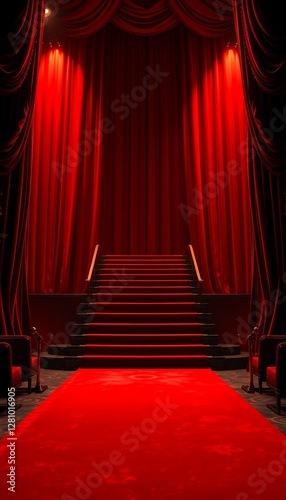 Fototapeta premium Red Carpet Stairway Under Dramatic Theatre Curtains