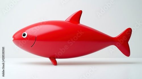Fototapeta premium Red cartoon fish illustration against white background. Simple design, playful mood. Shiny, smooth surface texture. Minimalist style