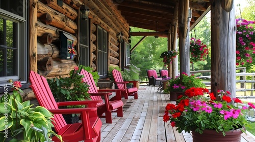 © Mahmud Creative, Naklejka premium Red chairs and tables on veranda of a house with green plants