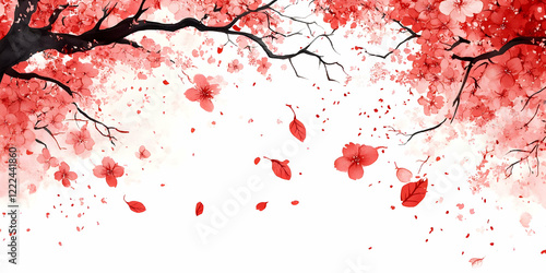 © Pumapala, Obraz premium Red cherry blossoms falling, spring branch, white background, design element