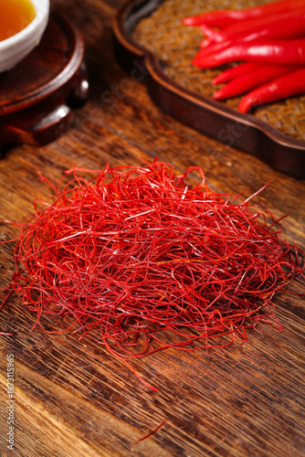 Naklejka premium Red Chili Pepper Shreds and Bell Peppers on Wooden Board - Spice Cooking Ingredients