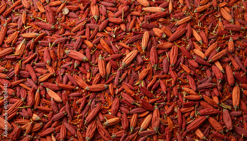 Fototapeta premium Red chili seeds scattered on textured surface in natural light