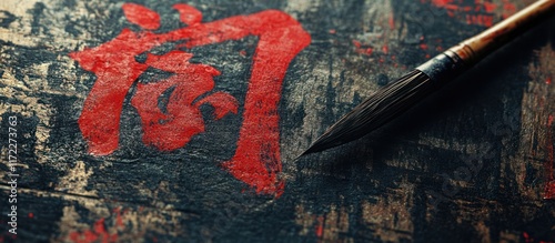 © Rania, Fototapeta premium Red Chinese calligraphy character on aged wood with calligraphy brush.