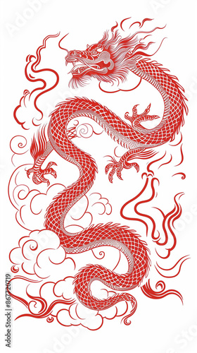 Fototapeta premium Red Chinese Dragon Ascending Through Clouds