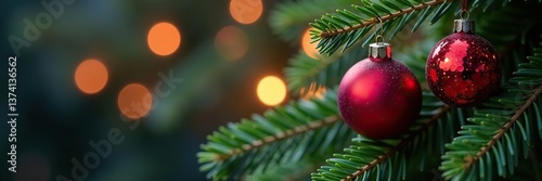 Fototapeta premium Red christmas baubles and bokeh fairy lights on a lush fir branch, perfect for winter season backgrounds or greeting cards, christmas, baubles