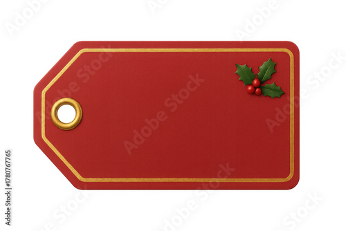 © PNG Kingdom , Obraz premium Red christmas gift tag with gold border and holly illustration, blank space for text ideal for holiday sales messaging