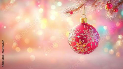 Fototapeta premium Red Christmas ornament hanging on a tree branch.