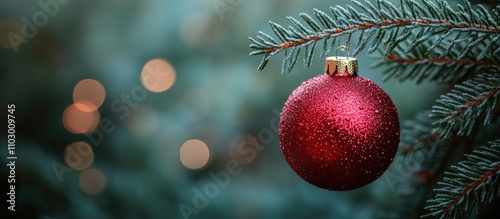 © -Quantum Pixels-, Obraz premium Red Christmas ornament hanging on pine branch with blurred festive background ideal for holiday themed designs and seasonal decorations
