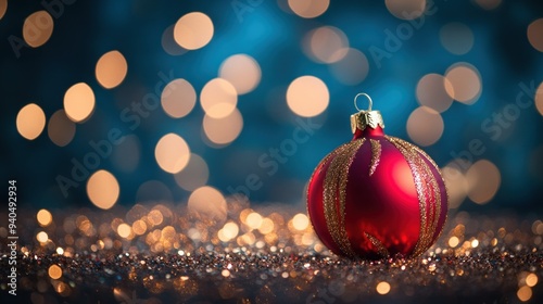 Fototapeta premium Red Christmas Ornament with Gold Glitter on a Glittery Surface