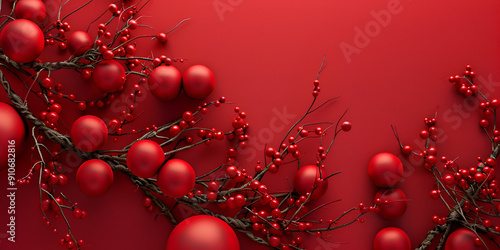 Obraz premium Red Christmas Ornaments and Berries on Red Background