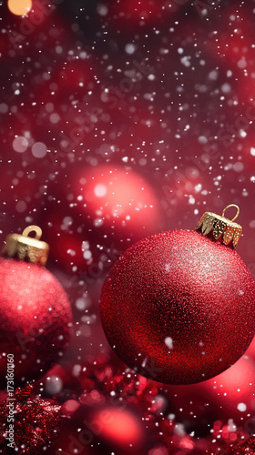 © Vasyl, Fototapeta premium Red Christmas ornaments sparkle with falling snow, perfect for a festive holiday greeting.