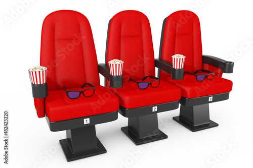 © doomu, Fototapeta premium Red Cinema Movie Comfortable Chairs with Popcorn and 3d Glasses. 3d Rendering