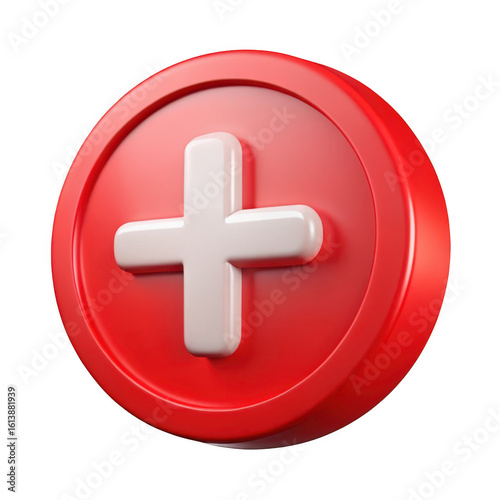 Fototapeta premium Red circular button with white plus sign isolated on transparent background