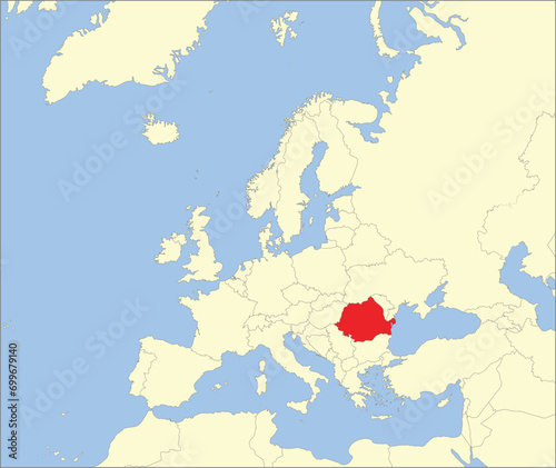 Fototapeta premium Red CMYK national map of ROMANIA inside detailed beige blank political map of European continent on blue background using Mollweide projection