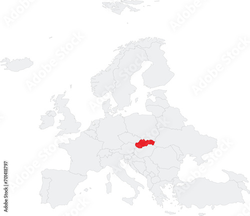 Fototapeta premium Red CMYK national map of SLOVAKIA inside gray blank political map of European continent on transparent background using Robinson projection