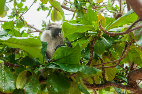Fototapeta premium Red colobus at the time of the meal on the tree. The island of Zanzibar, Tanzania