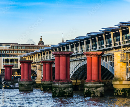 © Q77photo, Naklejka premium red columns in the water against the background of a bridge in L