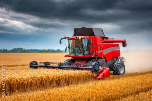 Obraz premium Red combine harvester harvesting wheat field under stormy sky