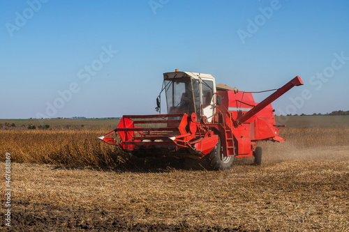 Obraz premium Red combine harvesting a crop of soybeans