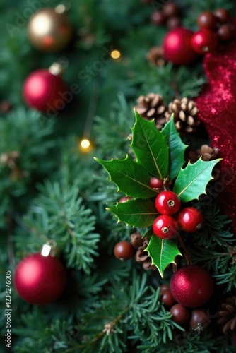 Fototapeta premium Red copy space with a few holly berries on it, christmas background, greenery, winter decor