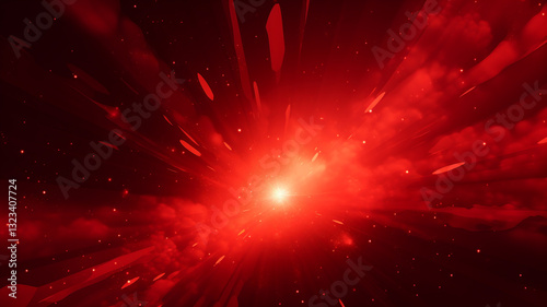© Riomat, Fototapeta premium Red cosmic explosion with glowing light and scattered particles in deep space