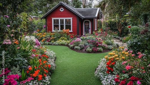 © Selvi, Fototapeta premium Red Cottage Garden: Blooming Flowers Surround Charming House in Lush Landscape