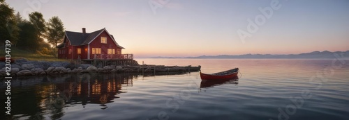 © Katherina, Fototapeta premium Red cottage with a wooden boat docked in the calm sea waters at dawn , red cottage, wooden