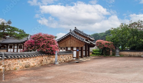 © sephoto, Fototapeta premium Red crape myrtle blooming in a traditional Korean Hanok garden