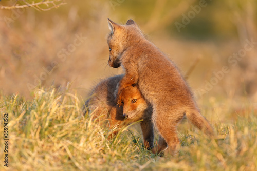 © Menno Schaefer, Obraz premium Red cubs in springtime playing in nature