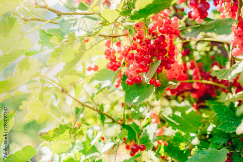 Fototapeta premium Red currant berries and green leaves in the autumn garden on a sunny day