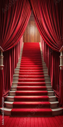 © Watcharapon, Fototapeta premium Red curtain draped over a staircase leading to a luxurious red carpet
