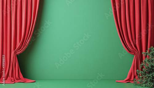 Fototapeta premium Red curtains opening on green wall background for copy space