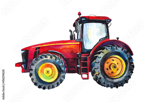 Obraz premium Red cute tractor . Watercolour. Print. Poster.