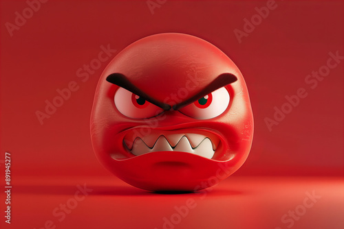 © Maxim, Naklejka premium red 3D angry face emoji, featuring a frowning mouth and furrowed brows, set against a solid red background. The intense expression and vibrant color convey strong feelings of anger and frustration