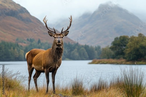 © Alienmarsh, Fototapeta premium Red Deer Buck Standing by Lake