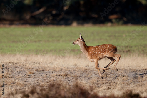 Obraz premium Red deer calf running on the moorland in rutting season in National Park Hoge...