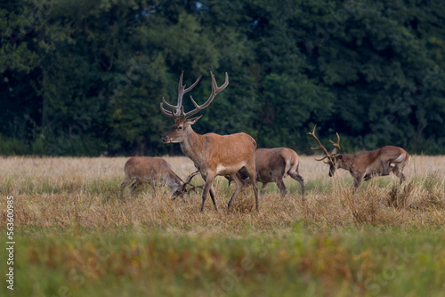 © Branislav, Fototapeta premium Red deer (cervus elaphus) herd grazing on meadow in autumn nature.