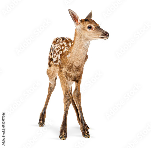© Eric Isselée, Fototapeta premium Red deer fawn standing on white background