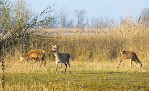© Naj, Fototapeta premium Red deer grazing in a field near a lake