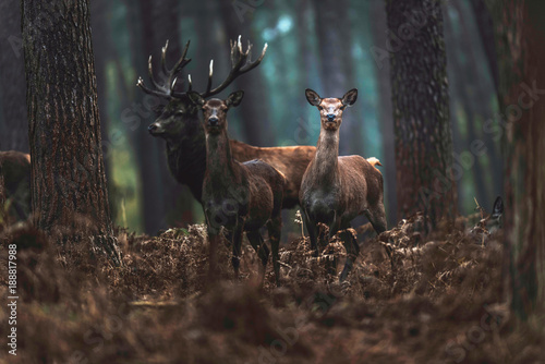 © ysbrandcosijn, Fototapeta premium Red deer hind and stag in autumn forest. North Rhine-Westphalia, Germany