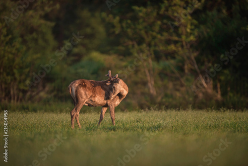 Fototapeta premium Red deer stag licking shoulder while standing in evening sun in meadow.