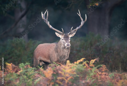 Naklejka premium Red deer stag standing in green ferns in autumn