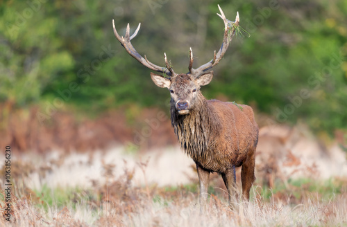 Naklejka premium Red deer stag standing with grass on antlers during the rut in autumn