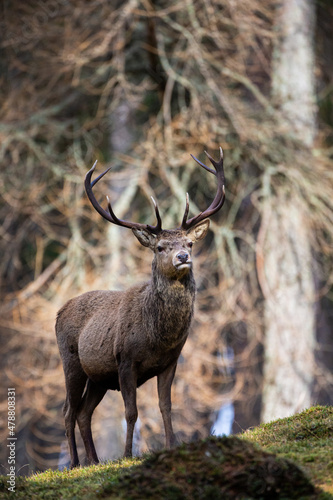 Naklejka premium Red deer stag walking amongst the pine trees in the Cairngorms of Scotland
