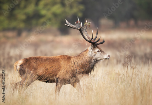 © giedriius, Obraz premium Red deer stag walking in grass during the rut in autumn