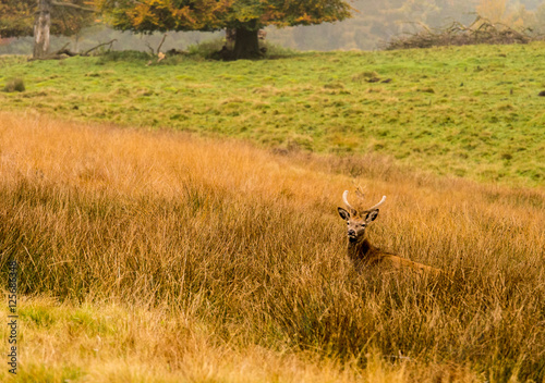 Naklejka premium Red deer stag withg large antlers during the rutting season at Tatton Park, Knutsford, Cheshire, UK