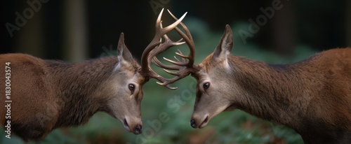 Obraz premium Red deer stags locked in a fierce intense rutting battle deep in the dense...